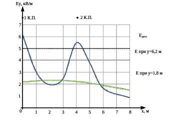 Аналогичным образом, подставляя в формулу (8.1) различные значения расстояния до оси путей двухпутного участка, находим вертикальную составляющую напряженности электрического поля для двух случаев, результаты расчета сводим в таблицу 8.1 и строим график напряженности электромагнитного поля в зависимости от расстояния до оси путей двухпутного участка (рисунок 8.1).