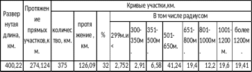 Протяженность кривых участков пути составляет 126,093 км (31,5% протяжения кривых от развернутой длины главных путей), 375 штук кривых.
