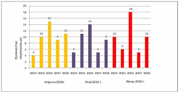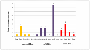Рисунок 3.8 Количество перекосов пути по месяцам на 8004-8008 км Завитинской дистанции пути в 2016 году.