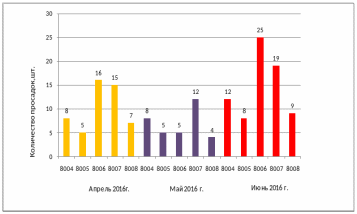 Рисунок 3.9 Количество просадок пути по месяцам на 8004-8008 км Завитинской дистанции пути в 2016 году.