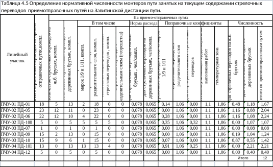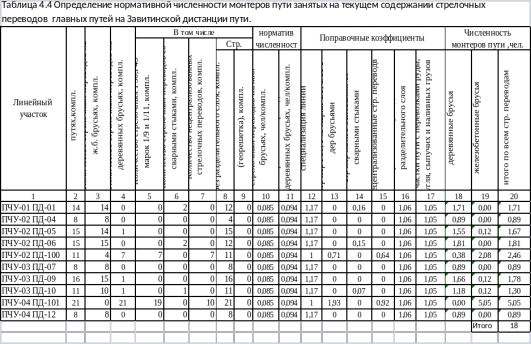 | Линейный участок | Всего на приемотправочных путях, км | Участки пути со скреплениями на бесстыковом пути, км. | Участки пути со скреплениями на звеньевом пути, км. | Норматив численности монтеров пути на бесстыковом пути со скреплениями, чел/км | Норматив численности со скреплениями на звеньевом пути, чел/км. | Поправочные коэффициенты | нормативная численность монтеров пути, человек. | ||||||||||||||||