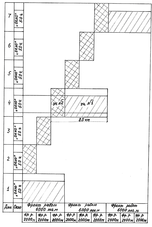 Организация работ на участке № 2 (основной этап). До начала «окна» 7 монтеров пути № 1–7 раскладывают новое скрепление из контейнеров по фронту работ, 5 монтеров пути № 8–12 снимают оставшиеся пикетные знаки.