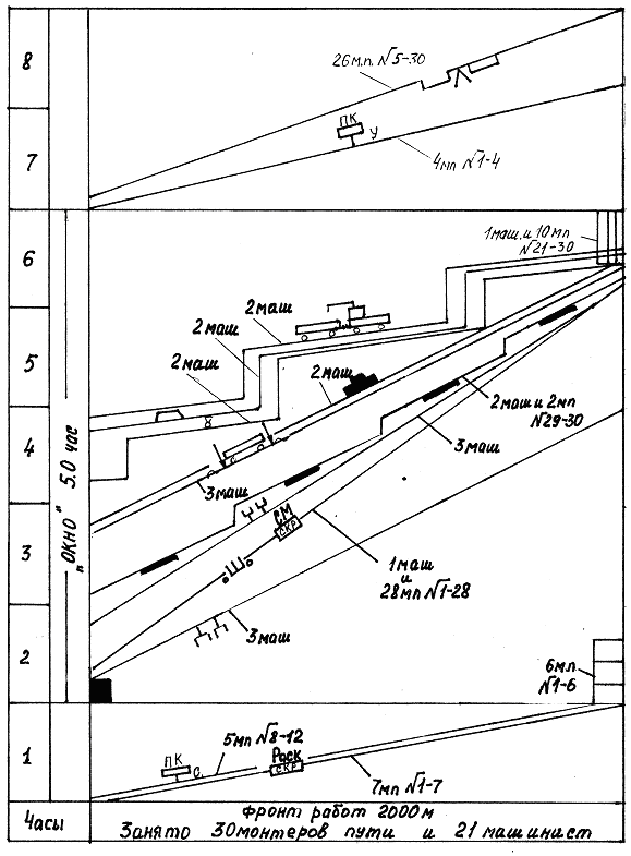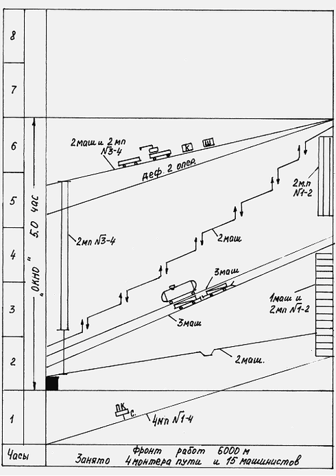 После открытия перегона 4 монтера пути № 1–4 устанавливают пикетные знаки, а 26 монтеров пути № 5–30 выполняют подрезку балластной призмы ниже подошвы рельсов на 3 см.