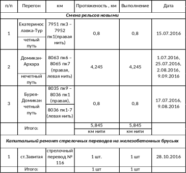 Таблица 1.10 Выполнение капитального ремонта пути в 2016 год.