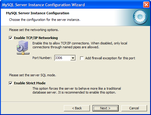 При выборе «Enable TCP/IP Networking», включается поддержка TCP/IP соединений и выбирается порт, через который они будут осуществляться. Стандартным для сервера MySQL является порт 3306. Отметив «Enable Strict Mode», задается режим строгого соответствия стандарту SQL (данную опцию рекомендуется оставлять включенной) (рисунок 3.8).