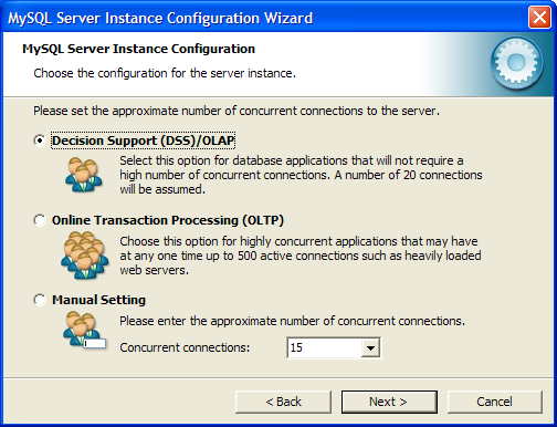 В данном диалоговом окне представлен выбор максимально возможных подключений к серверу MySQL. При выборе «Decision Support (DSS)/OLAP», максимальное количество подключений будет ограничено двадцатью, чего более чем достаточно при установке сервера на домашнем компьютере и отсутствии большого количества одновременных подключений (Рисунок 3.7).