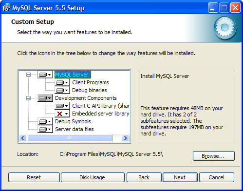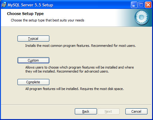 Для установки MySQL сервера загружается последняя версия клиента с оригинального сайта по ссылке: http://dev.mysql.com/downloads/installer/. Запускается клиент и устанавливается выборочная установка компонентов «Custom» (Рисунок 3.1).
