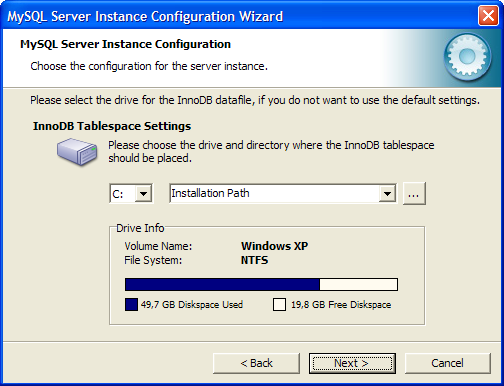 Далее, выбирается диск и директория для хранения таблиц типа InnoDB (рисунок 3.6).