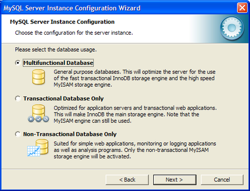 При выборе пункта «Multifunctional Database», появляется возможность работать, как с таблицами типа InnoDB (с возможностью использования транзакций), так и с высокоскоростной MyISAM (как правило для веб-разработок используется именно этот тип таблиц) (рисунок 3.5).