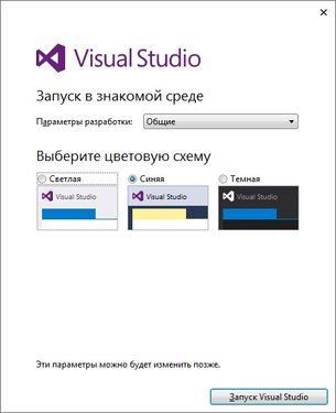 Далее идет выбор цветовой схемы и параметров запуска, «Общие» и «Синяя», «Запуск Visual Studio» (рисунок 3.17).