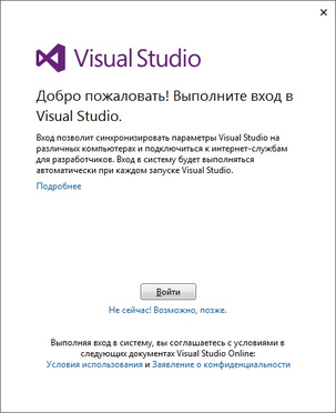 После того как компьютер перезагрузится, запускается Visual Studio, и при первом запуске требуется выполняется вход в Visual Studio, для того чтобы синхронизировать параметры при подключении с разных компьютеров (более подробную информацию можно получить, перейдя по ссылке «Подробнее»). Но это не обязательно, можно нажать «Не сейчас! Возможно, позже» (рисунок 3.15).