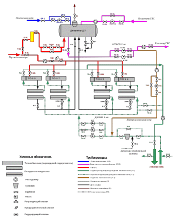 Перегретый пар поступает из сети завода с давлением 1,3 МПа температурой 220-250°С, затем редуцируется в бойлерной до 0,7 МПа. Часть пара с давлением 0,7 МПа редуцируется до давления 0,02 МПа и подается в качестве греющего пара на деаэраторы.