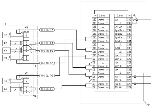 На рисунке 4.5 изображена схема подключения датчиков температуры и вибрации коренного и полевого подшипников насоса Н-1, для оставшихся насосов Н-2 и Н-3 данная схемы выполняется аналогично.