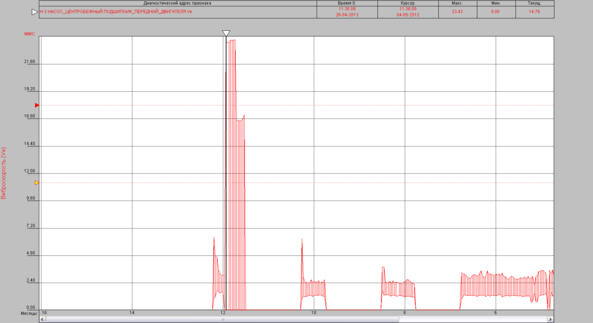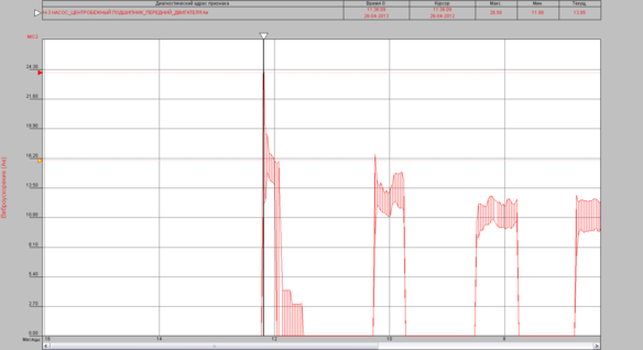 Системой КОМПАКС-М был предупреждён внезапный аварийный останов агрегата Н-3. При пуске данного агрегата на тренде виброускорения переднего подшипника двигателя наблюдается уровень, превышающий пороговое значение НДП (24 мм/с2), составляет он 26,58 мм/с2. В течении суток уровень виброускорения падает до допустимых значений (рисунок 4.9). Далее 04.05.2012 происходит резкий рост виброскорости (рисунок 4.10) до 23,42 мм/с (порог НДП 18 мм/с), так же значение виброперемещения Se в этот момент составляет 289 мкм (порог НДП 57 мкм). Далее происходит понижение уровней Ve до 16,6 м/с, Se до 205, 97 мкм. Персонал по рекомендациям системы «КОМПАКС-М» проводит остановки и применяет меры по снижению вибронагруженности данного узла (подтягивание опор электродвигателя, добавление смазки в подшипниковый узел), но кардинально ситуация не изменилась. Агрегат был остановлен и отправлен на ремонт. После запуска уровни Ae, Ve, Se составляют 13,9 мм/с2, 2,39 мм/с, 17,7 мкм соответственно.
