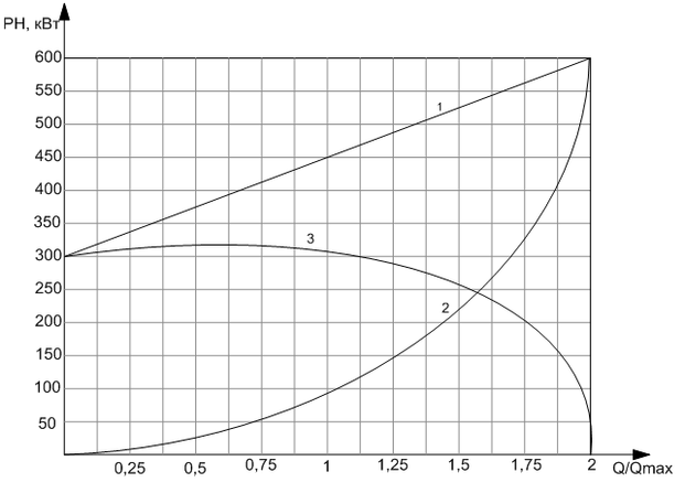 Рисунок 6.1 – Потребление мощности при различных способах регулирования скорости вращения насоса: 1- при управлении задвижками; 2 – при частотном регулировании; 3 – экономия электроэнергии.