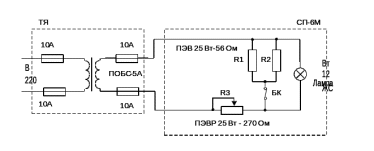 Выбор величины сопротивления резистора определяется исходя из номинального напряжения вторичных обмоток трансформатора ПОБС-5А (Uн=44 В). На основании произведенных расчетов для обогрева выбран резистор типа ПЭВ-25-56 Ом. Принципиальная схема включения электрических обогревателей и внешний вид резистора типа ПЭВ-25-56 Ом изображены на рисунках 1.1 и 1.2 соответственно.
