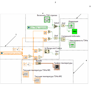 В блоке 1 изображены элементы: «Температура рельса» – глобальная переменная (Global) используется для передачи данных между ВП на одном компьютере, в данном случает источником является слайдер «Температура рельса», использующийся на главной блок-диаграмме программы на рисунке 2.7. Элемент «Сложить» – функция рассчитывает сумму входов, одним из которых является константа, а на другой поступают данные температуры. Элемент «Вычесть» – функция рассчитывает разность входов, одним из которых является константа, а на другой поступают данные температуры. «Нахождение в диапазоне и ограничение» – эта функция определяет нахождение значения в диапазоне, заданном входами «верхний предел» и «нижний предел», и дополнительно ограничивает выходное значение указанным диапазоном. Логическая функция «НЕ» возвращает значение «ЛОЖЬ» (0) при подаче на вход значения «ИСТИНА» (1), и наоборот [17].