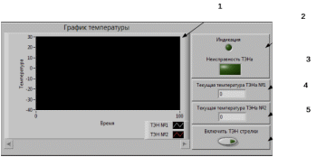 В блоке 4 изображены элементы: «График температуры» – графический индикатор, имитирующий работу развертки осциллограммы, поступающие данные нумеруются по оси абсцисс целыми числами. Для отображения двух и более наборов данных от разных источников производится объединение в кластер с помощью функции «Объединить» (Bundle). «Текущая температура ТЭН №1», «Текущая температура ТЭН №2» – числовой элемент индикации с плавающей запятой двойной точности.