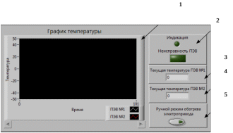 В блоке 5 изображены элементы: «График температуры» – графический индикатор, имитирующий работу развертки осциллограммы, поступающие данные нумеруются по оси абсцисс целыми числами. Для отображения двух и более наборов данных от разных источников производится объединение в кластер с помощью функции «Объединить» (Bundle). «Текущая температура ПЭВ №1», «Текущая температура ПЭВ №2» – числовой элемент индикации с плавающей запятой двойной точности.