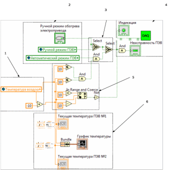 В блоке 2 изображены элементы: «Ручной режим ПЭВ», «Автоматический режим ПЭВ» – глобальная переменная (Global) используется для передачи данных между ВП на одном компьютере, в данном случает источниками логической переменной являются кнопки «Ручной режим обогрева электроприводов» и «Автоматический режим обогрева электроприводов» соответственно. Данные кнопки используются на главной блок-диаграмме программы, изображенной на рисунке 2.7. Кнопка «Ручной режим электропривода» используется в качестве логического элемента, который может находиться в двух состояниях «ИСТИНА» (1) и «ЛОЖЬ» (0).