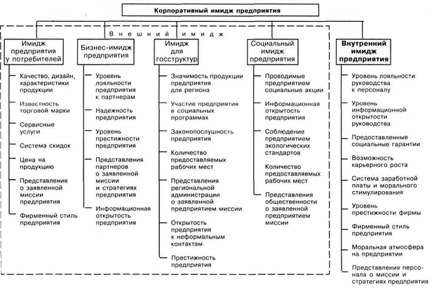 Имидж предприятия у потребителей составляют представления людей относительно уникальных характеристик, которыми, по их мнению, обладает продукция предприятия: качество, дизайн, известность торговой марки; предоставляемые предприятием сервисные услуги и система скидок; цена на продукцию; представления потребителей о заявленной миссии и стратегиях предприятия, а также его фирменный стиль.