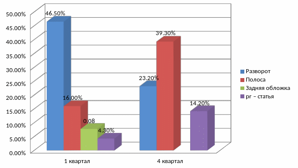 Как видно из таблицы 8 и рисунка 6, наибольший удельный вес в рекламных позициях в 1 кв. 2015 г. занимает разворот - 46,5%; на втором месте - полоса 16%; и на третьем месте - задняя обложка - 7,8%. В 4 кв. наибольший удельный вес принадлежит рекламной позиции – полоса - 39,3%; второе место занимает разворот 23,2%; третье место принадлежит pr-статье - 14,2%. Данные показатели связанны с объёмами продаж и предпочтениями рекламодателей, так как клиент выбирает рекламную позицию.[9]