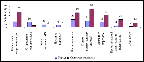 Распределение ответов на первый вопрос представлено на рисунке 9. Таким образом, можно сделать вывод, что структура услуг для клиентов ОПС, которые расположены в городе и в сельской местности различаются. Так, горожане преимущественно пользуются услугами экспресс-почты и отправлениями первого класса, в сельской же местности ОПС - это место, где получают пенсию и оплачивают коммунальные услуги.