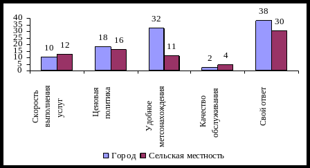 Таким образом, среди всех представленных вариантов, большее количество респондентов, как горожан, так и сельских жителей указали вариант «Свой ответ». Причем у большинства опрошенных в городе свой вариант звучал как «По привычке», а для сельской жителей «Потому что нет альтернативы Почты России (нет конкурентов). Удобное местоположение также является популярным ответов, для многих потребителей услуг связи и финансовых услуг ОПС расположены ближе к дому, чем, к примеру, отделения банка.