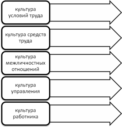 5) Культура работника: нравственная культура (поведение, знание этикета, хороших манер, нравственность, ценностные ориентации, убеждения и культура чувств) и культура труда (уровень образования и квалификации, отношение к труду, дисциплинированность, исполнительность, творчество на рабочем месте) [18].