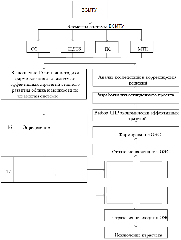 что позволяет принять любую из них к реализации. Приведенный пример позволяет сформировать методику поиска эффективных стратегий для поддержки принятия решений этапного развития ВСМТУ в целом. Методика базируется на системном представлении элементов ВСМТУ и показана в виде блок-схемы на рисунке 3.2.2