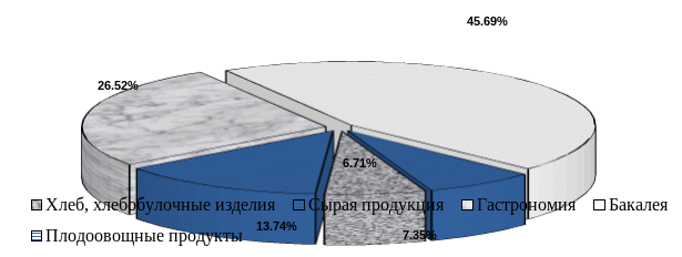 Таким образом, наибольший удельный вес в составе ассортиментного перечня продовольственных товаров магазина занимает бакалея – 45,69 %. На втором месте в составе ассортиментного перечня находятся гастрономические товары – 26,52 %, на третьем месте – сырая продукция – 13,74 %. Далее следуют: овощи / фрукты – 7,35 %, а также хлеб и хлебобулочные изделия – 6,71 %.