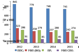 На рисунке 6 представлено распределение работников университетского комплекса по категориям ППС, ПР и учебно-вспомогательного персонала (УВП) для видов обучения за период 2012–2015 гг. Средний возраст ППС и ПР университетского комплекса составляет 47,8 лет.