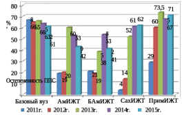 Во всех филиалах за исключением АмИЖТ и БАмИЖТ, показатель остепенённости превышает 60%-ный уровень. Так же выражен тренд снижения данного показателя в базовом вузе.