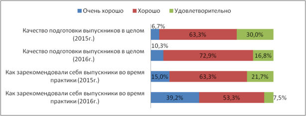 Оценивая качество подготовки выпускников и студентов-практикантов по нескольким направлениям: практическая работа, проектная, исследовательская и преподавательская (таблица 6), в этом учебном году хороший уровень подготовки выпускников работодатели отмечают в направлении всех видов работ.