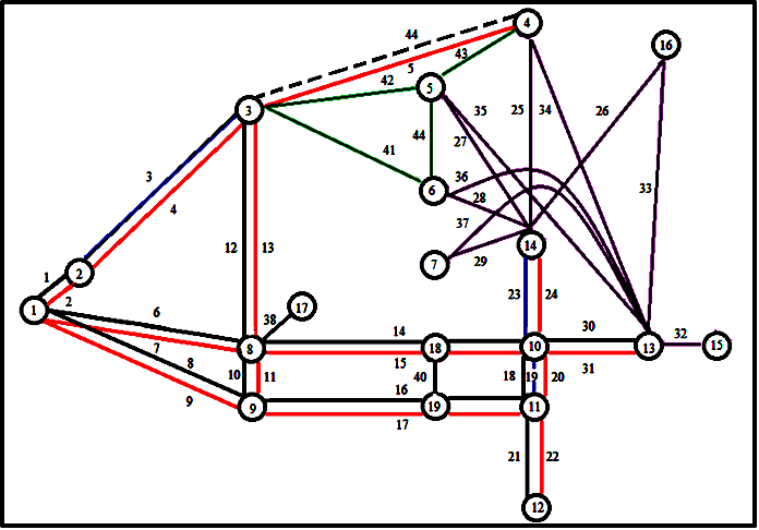 Региональные мультимодальные транспортные коридоры формируются как последовательность региональных мультимодальных транспортных звеньев, увязанная в пространстве региональными мультимодальными транспортными узлами, которые представлены на рисунке 4.6. Таким образом, в данной модели (рис. 4.6) рассматриваются девятнадцать региональных мультимодальных транспортных узлов (РМТУ) разных уровней иерархии Дальневосточного и Северо-Восточного регионов, соединенных региональными мультимодальными транспортными звеньями (РМТЗ), представленными разными видами транспорта.