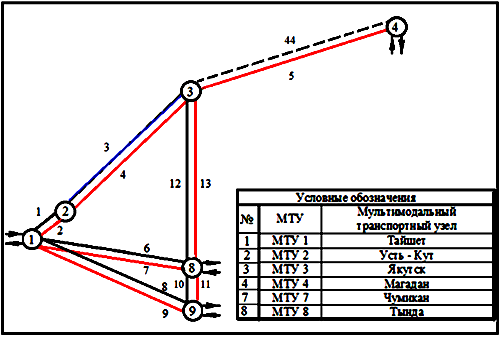 2) В соответствии с принятыми в разделе 4.2 решением в данной работе рассматриваются 19 мультимодальных транспортных узлов (МТУ) разных уровней иерархии (табл. 4.3) Дальневосточного и Северо-Восточного регионов, соединенных региональными мультимодальными транспортными звеньями (табл. 4.5), представленными разными видами транспорта.