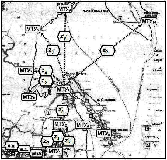 Для устойчивого и непрерывного снабжения районов Дальневосточного и Северо-Восточного регионов потребными объемами перевозок необходимо формировать региональные мультимодальные транспортные коридоры с учетом использования всех существующих транспортных коммуникаций с последующей оценкой их эффективности и выбора наиболее целесообразных. Формирование региональных мультимодальных транспортных коридоров зависит от наличия существующих транспортных коммуникаций от пункта «зарождения» до пункта «схода» грузов и выполняется путем соединения РМТЗ в исследуемом направлении и в соответствии с принципом кратчайшего расстояния. Поскольку от пунктов МТУ3 и МТУ4 до пунктов «схода» грузов (МТУ5 - МТУ10) отсутствуют наземные транспортные коммуникации федерального значения, грузовые перевозки в данных направлениях осуществляются морским транспортом. На рисунке 4.7 показана схема сформированных вариантов РМТК «река-море» и «море».