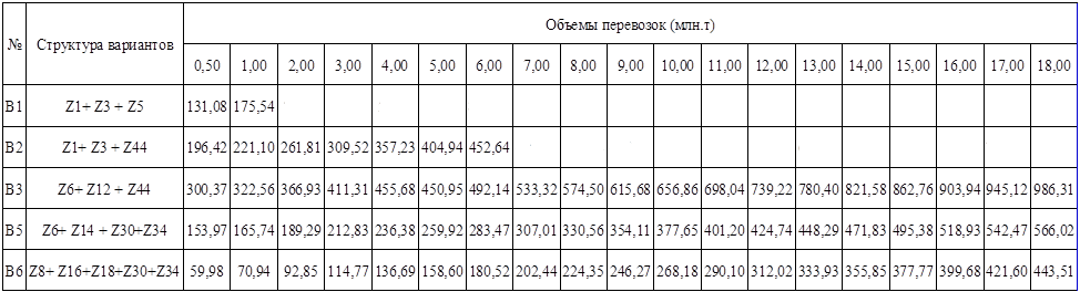 Для выбора наиболее целесообразных сформированных вариантов региональных мультимодальных транспортных коридоров в соответствии с методикой, разработанной в главе 2, производится расчет дисконтированных строительно-эксплуатационных расходов в зависимости от различных значений объемов перевозок.