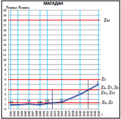 Анализ рисунка 4.9 показал, что все варианты, которые имеют в своем составе Z4, Z5 позволяют работать до 2013 года, варианты, имеющие в своих рядах Z2, Z7, Z9, Z11, Z13 позволяют работать при данном прогнозе до 2023 года и варианты, имеющие в своем составе Z3, позволяет работать до 2025 года. Наконец расчетного периода надо строить железную дорогу на Магадан.