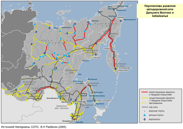 По данным СОПСа на рис.2.3 показана перспектива очертания автодорожной транспортной сети Дальнего Востока и Забайкалья.
