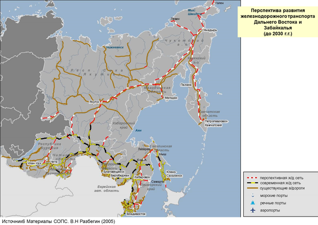 Для того чтобы начать дальше строить методику экономической оценки и намечать варианты выходов из очагов природных ресурсов на опорную транспортную сеть и рассматривать варианты завоза грузов в районы Северо-Востока, необходимо рассмотреть предложения разных институтов по перспективному развитию транспортной сети Сибирского и Дальневосточного федеральных округов. На рис.2.2 по данным СОПС показана перспектива очертания железнодорожной транспортной сети Дальнего Востока и Забайкалья.