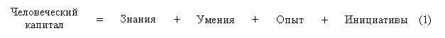 Человеческий капитал организации можно определить как знания, навыки, опыт и инициативы, которыми обладают сотрудники, и представить в виде формулы (1):