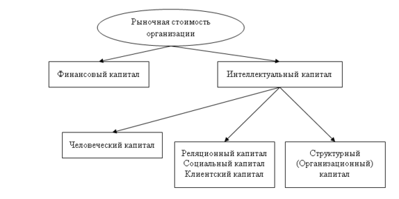 Интеллектуальный капитал организации представлен знаниями, создающими богатства организации. Такие знания могут считаться нематериальными активами, которые способствуют повышению качества внутренних процессов и создают добавленную стоимость. Интеллектуальный капитал считается активом, который может использоваться для управления прибыли, привлечения новых клиентов, создавать новые продукты или иным образом улучшить бизнес. В целом интеллектуальный капитал можно определить как совокупность всех информационных ресурсов, имеющихся в распоряжении организации. Компонентами интеллектуального капитала принято считать сочетание человеческого капитала, структурного (организационного) капитала и реляционного (социального) капитала. В состав интеллектуального капитала также включают информационный капитал, интеллектуальную собственность, клиентский капитал, узнаваемость бренда и учебный капитал. Интеллектуальный капитал представляет собой накопление полезных явных и неявных знаний в организации.