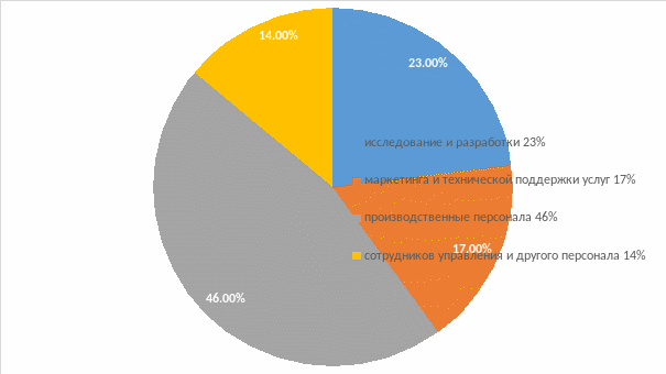 В компании Lenovo работает более 60 000 человек. Среди них участвуют в исследованиях и разработки около 23%, маркетинга и технической поддержки услуг приходилось 17%, 46% работников это производственный персонал, 14% сотрудников управления и другого персонала.