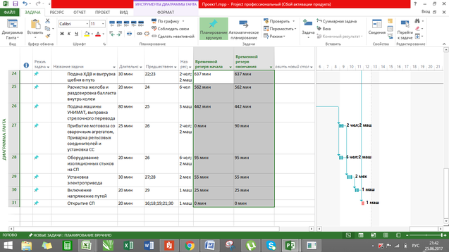 В первую очередь устраним резервное время начала операций, для этого воспользуемся автоматическим планированием, которое разместит задачи на временной шкале. Автоматическое планирование задач на диаграмме Ганта позволяет найти оптимальное время для проведения всего процесса операций. Таким образом получим оптимизированный сетевой график ремонта стрелочного перевода в Приложении В, где критическое время выполнения задач составляет 2 часа «до окна» и 9,67 часов в режиме «окна». Задачи, для которых не удалось сократить резервное время начала, необходимо пересмотреть технологию организации процесса и рассмотреть возможность внедрения более совершенного машинного парка.