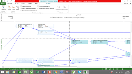 На фрагменте сетевого графика, рисунок 3.3, красной заливкой отмечаются задачи, расположенные на критическом пути, синие - задачи с резервом времени окончания выполнения задачи.