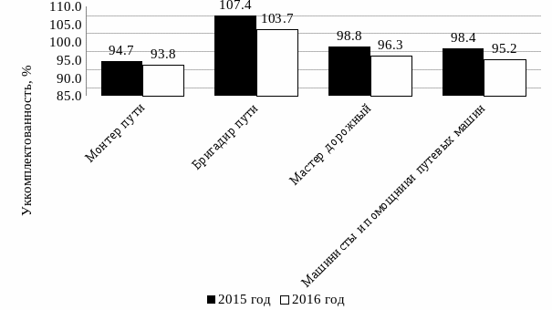 В следствие неукомплектованности персоналом по таким профессиям как монтеры пути, дорожный мастер, машинисты и помощники машинистов, укомплектованность кадров на 2016 год составила 96,3%. Причинами снижения коэффициента на 3,2% стали увольнения работников по собственному желанию, а также ощущается нехватка кадров данной области в связи с непристижностью профессий и отсутствием квалифицированных соискателей на данные должности. Для наглядности укомплектованность по основным профессиям за 2015-2016гг представлена в виде гистограммы на рисунке 2.3.