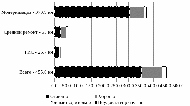 Всего отремонтировано и оценено 455,6 км, из них «отлично» - 353,4 км, и «хорошо» - 81,0 км, остальные получили оценки «удовлетворительно» и «неудовлетворительно». Основными причинами снижения оценки явилось: малоэффективная работа машины по стабилизации пути и отсутствие повторной выправки пути из-за поздней укладки рельсовых плетей. По РИС оценкой «хорошо» оценено 6,3 км. по причине незавершения полного комплекса выправочных работ. по среднему ремонту больное земельное полотно и наличие пучин.