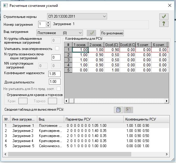 Также для районов с сейсмичностью выше 6 предусматривается особое сочетание нагрузок, состоящее из постоянной (Ψ = 0,9), длительной (Ψ = 0,9), кратковременной (Ψ = 0,5) и сейсмической (Ψ = 1) нагрузок.
