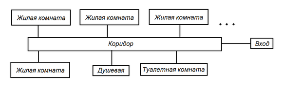 Основным принципом планировки зданий общежитий является планировка коридорного типа. Разделение мужчин и женщин осуществляется проживанием рабочих на разных этажах. На каждом этаже предусматриваются туалетные комнаты, душевые.